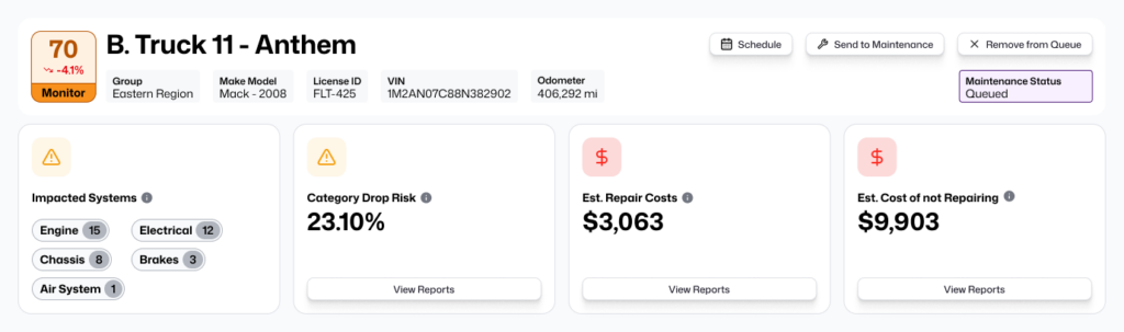 Questar’s AI-driven fleet health solution prices the cost of failures that can be prevented. By identifying issues early, Questar gives real dollar terms to the cost to fix problems proactively. This gives fleet managers clear visibility into costs, savings, and impact before scheduling service.