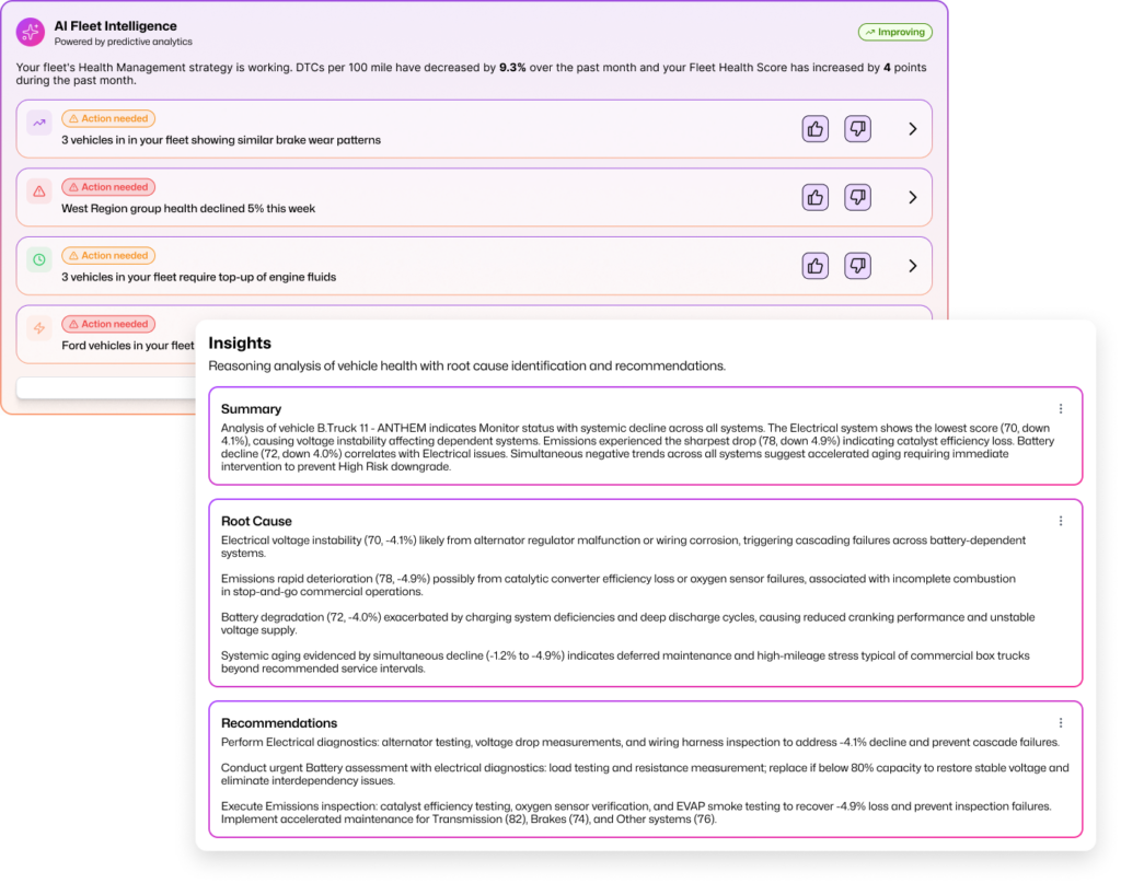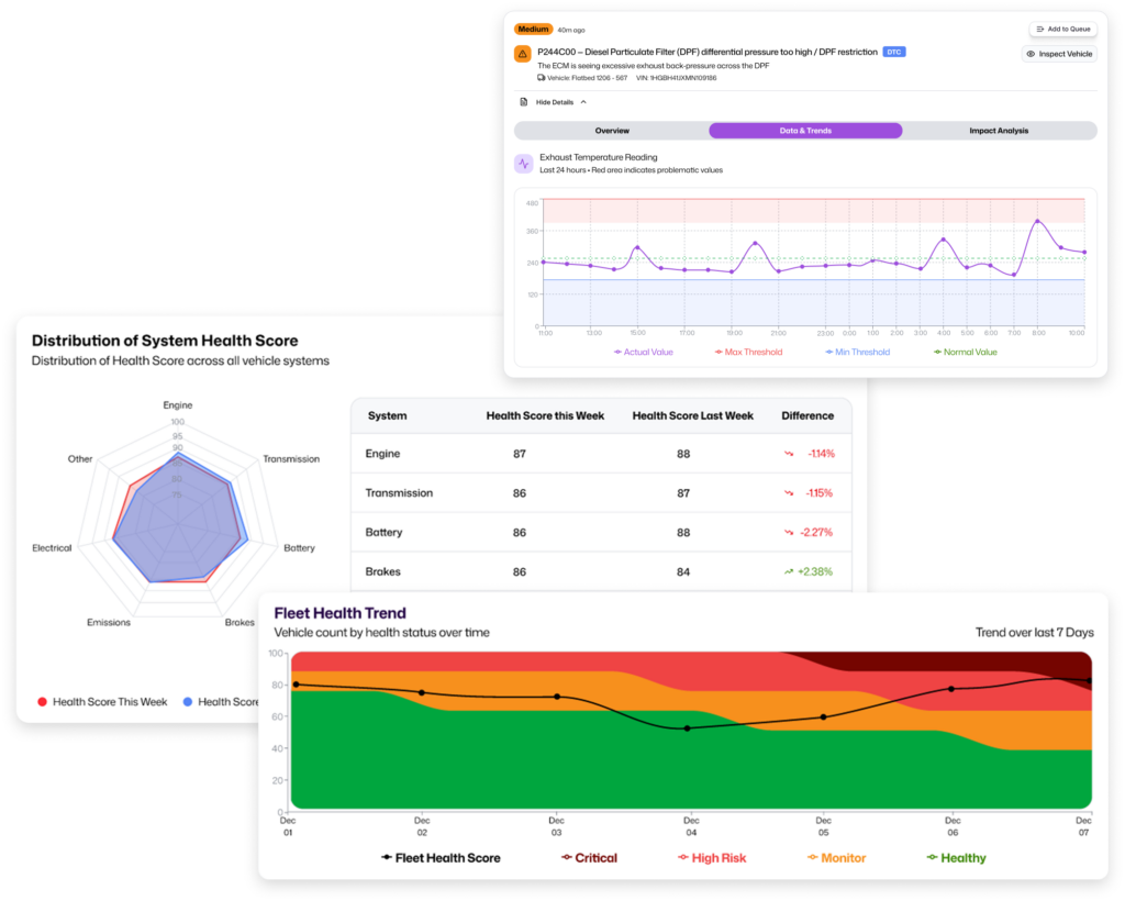 Our platform normalizes diagnostic and telematics data across vehicle makes, models, model years, and even disparate telematics ecosystems, delivering consistent, comparable insights regardless of fleet complexity.